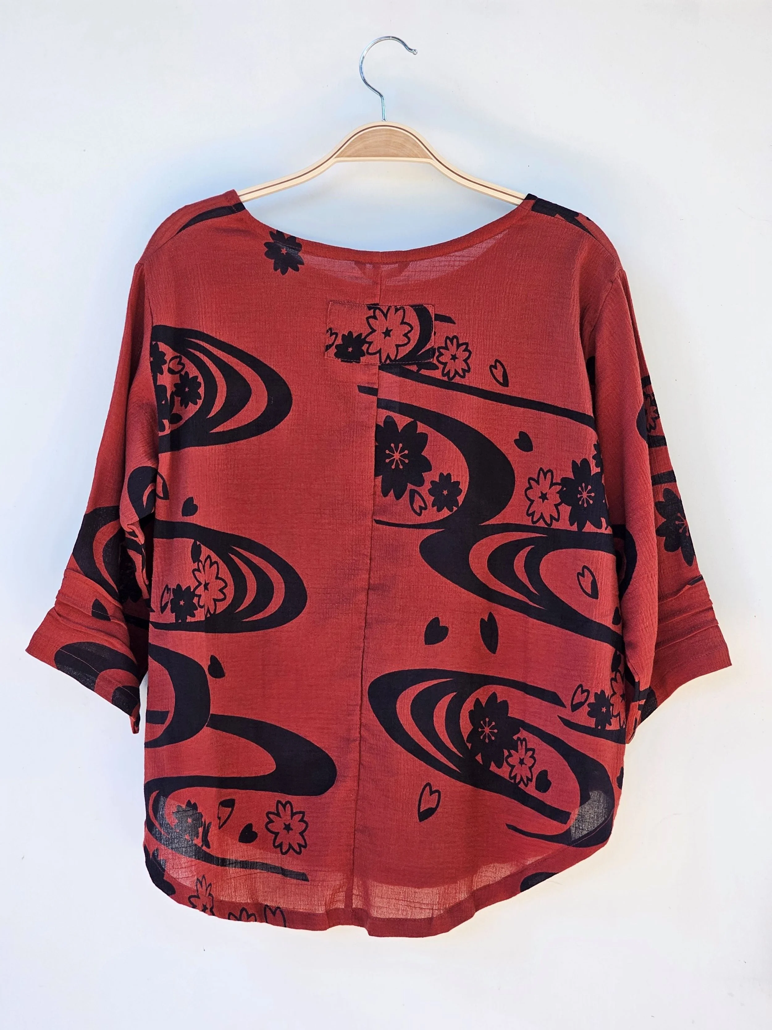 Ideal for warmer days, the Essential Blouse is crafted from lightweight, breathable cotton with a softly crinkled, gauze-like texture. Designed with a high, rounded neckline and a flattering A-line silhouette, it features elbow-length sleeves accented by a trio of delicate pleats. The curved shirttail hem is slightly longer in the back, complemented by a subtle patch detail at the upper back. Finished with a charming sakura (cherry blossom) print for a graceful, feminine touch.